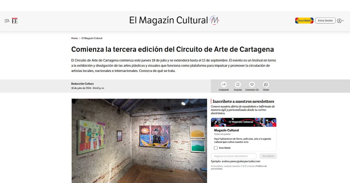El Circuito de Arte de Cartagena comienza este jueves 18 de julio y se extenderá hasta el 13 de septiembre. El evento es un festival en torno a la exhibición y divulgación de las artes plásticas y visuales que funciona como plataforma para impulsar y promover la circulación de artistas locales, nacionales e internacionales.