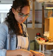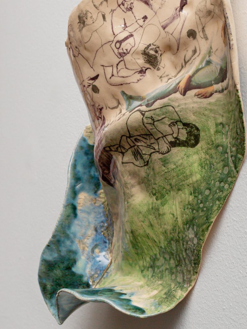 Adicionalmnte, estudia y trabaja la cerámica desde los 7 años. Explora el collage de capas de lenguaje visual mediante diversas técnicas de impresión sobre cerámica, construyendo paisajes saturados que reflejan su interés por la noción del «arrume».